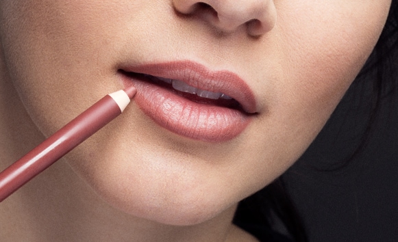 Обведите контур губ прозрачным карандашом для губ. Закрасьте губы карандашом с оттенком.